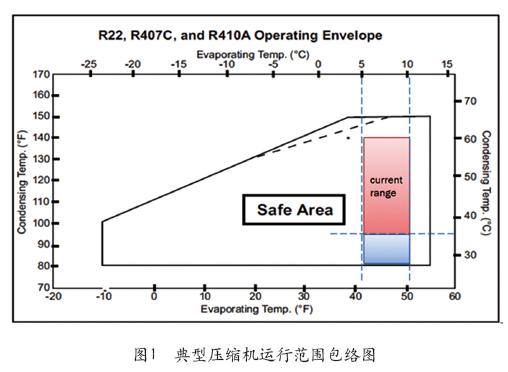 我們知道傳統(tǒng)風(fēng)冷空調(diào)在過渡季節(jié)當(dāng)室外環(huán)境溫度降低時,冷凝器冷凝效果變好,冷凝溫度會降低,此時壓縮機功耗也會降低。理論上,壓縮機工作點只要落在壓縮機運行包絡(luò)區(qū)域安全范圍內(nèi)(見圖1中整個safeAres區(qū)),冷凝溫度越低越好,最低可將降到25℃左右。但我們還需要設(shè)定冷凝風(fēng)機調(diào)速控制器或冷凝壓力控制閥,來限制冷凝溫度(冷凝壓力)降低、減弱冷凝能力,這是為什么呢?