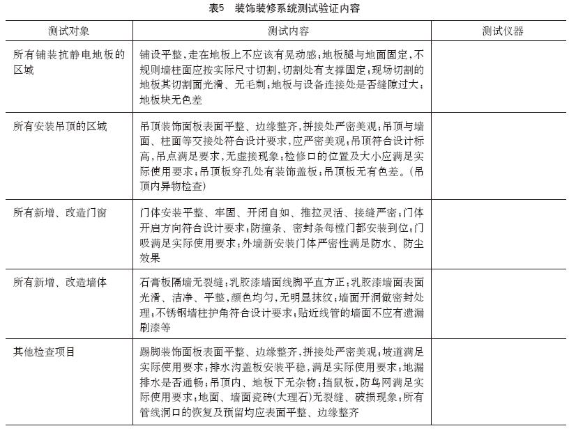 數(shù)據(jù)中心基礎(chǔ)設(shè)施為用戶的業(yè)務(wù)需求提供支撐,同時它也是一個建筑主體,需要滿足設(shè)備、人員對裝飾裝修方面的相關(guān)要求。裝飾裝修系統(tǒng)的測試驗證工作主要是對地板、吊頂、門窗、墻體等是否符合規(guī)范的檢查。有關(guān)裝飾裝修系統(tǒng)的測試驗證主要工作內(nèi)容見表5。