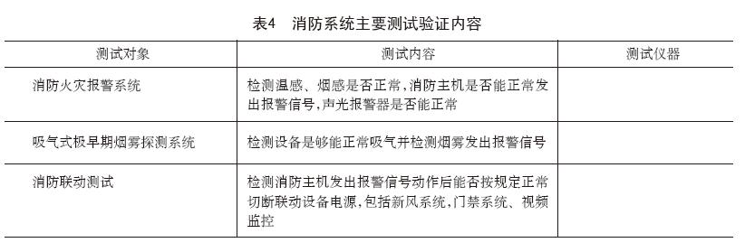 數(shù)據(jù)中心如果發(fā)生火災(zāi),會毀壞計算機設(shè)備,中斷正常的系統(tǒng)運行,甚至危及工作人員的生命,所以消防系統(tǒng)非常重要。對于消防系統(tǒng)的測試驗證工作主要就是檢查報警系統(tǒng)、滅火系統(tǒng)、排煙系統(tǒng)是否能夠在早期發(fā)現(xiàn)火災(zāi)隱患,準(zhǔn)確及時報警,在火災(zāi)發(fā)生后快速滅火,并將有害氣體排出。有關(guān)消防系統(tǒng)的測試驗證主要工作內(nèi)容見表4。