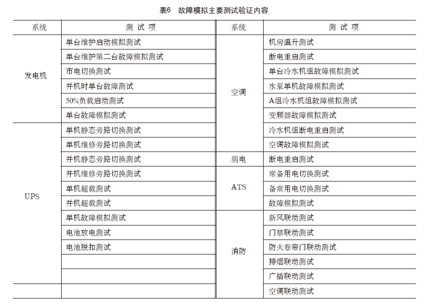 故障模擬測試是借助假負(fù)載營造數(shù)據(jù)中心上線后的實際運行情況,然后模擬機房運行中可能出現(xiàn)的故障,來驗證各系統(tǒng)在出現(xiàn)故障情況下的反應(yīng)是否符合設(shè)計預(yù)期,從而判斷機房的抗故障能力和設(shè)計等級。故障模擬測試不但是驗證機房實際運行能力的重要手段,也為運維團隊提供應(yīng)對緊急狀況的實踐經(jīng)驗,運維人員應(yīng)該在故障模擬測試過程中了解系統(tǒng)的薄弱環(huán)節(jié)、總結(jié)有可能出現(xiàn)的故障特征、制定最佳應(yīng)對流程,才能在以后的運維工作中遇到故障不慌亂,及時準(zhǔn)確地采取措施,將故障對系統(tǒng)運行的影響降到最低。有關(guān)故障模擬的測試驗證主要工作內(nèi)容見表6。