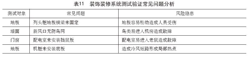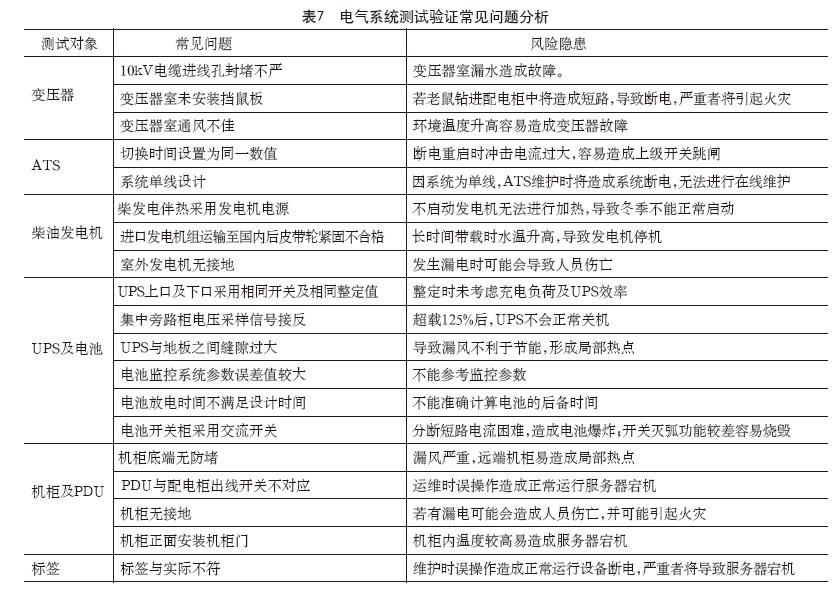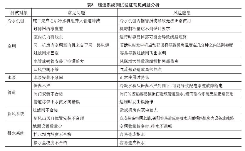 在測試驗證過程中,一些設(shè)備性能、系統(tǒng)聯(lián)動方面的問題就暴露出來,這也正是我們做測試驗證工作的目的。如果這些問題不及時發(fā)現(xiàn),進行整改,機房上線后就可能出現(xiàn)無法彌補的損失。按照驗證對象分類角度,列舉相關(guān)系統(tǒng)測試驗證中出現(xiàn)的常見問題及其危害,分別見表7至表11。