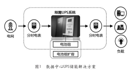 首先,作為儲(chǔ)能應(yīng)用的UPS須先擴(kuò)容電池組,讓全電池組參與儲(chǔ)能。電池容量的設(shè)計(jì)一定要保證60%作為儲(chǔ)能來(lái)用,剩余的40%作為UPS后備供電,如此才能讓電源充分滿足用戶的剛性用電需求。這套設(shè)計(jì)方案改造工程量小,系統(tǒng)收益率高,特別適用于數(shù)據(jù)中心、大型商業(yè)體。數(shù)據(jù)中心UPS儲(chǔ)能解決方案如圖1所示。