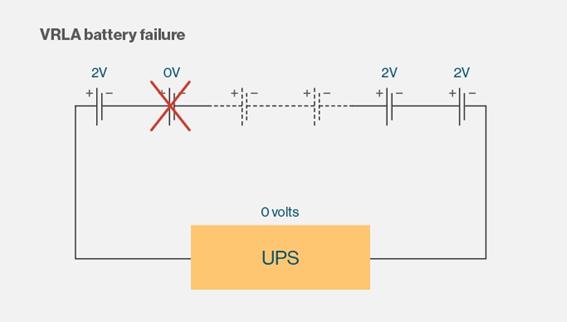 VRLA電池通常會(huì)造成全體失效:一個(gè)故障會(huì)導(dǎo)致整組電池串失效,沒(méi)有任何跡象能顯示具體是那個(gè)電池出的問(wèn)題(見(jiàn)圖2)。濕式電池失效故障或短路,會(huì)導(dǎo)致電池串總電壓降低,但UPS還是可以持續(xù)傳輸電能。